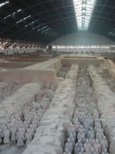 Sonntag war dann unser letzter Tag in Xi’an (Montagmorgen ging der Flieger zurück). Nach der Besichtigung des Glockenturms, ging es dann ins muslimische Viertel der Stadt. Muslimisch waren eigentlich nur das Essen und die Glaubensrichtung der anwesenden Chinesen, der Rest sah schon sehr nach China aus. Insbesondere die Fakestraße, an der es wieder dieselben Sachen gab wie überall, abgesehen von den kleinen TK-Armee-Figürchen. Nachdem wir uns den Magen mit Lammfleisch und Brot gefüllt hatten ging es zurück ins Hostel. Anschließend wurden die Hostelbar und der Salza Club der Stadt unsicher gemacht. Da es nun schon sehr spät war, kamen Basti und ich auf die grandiose Idee, die Nacht durchzumachen. Sagen wir so, es hätte einem besser gehen können auf dem Heimweg. In allem aber auch eine coole Reise und ein Besuch wert. Dieses Xi’an.